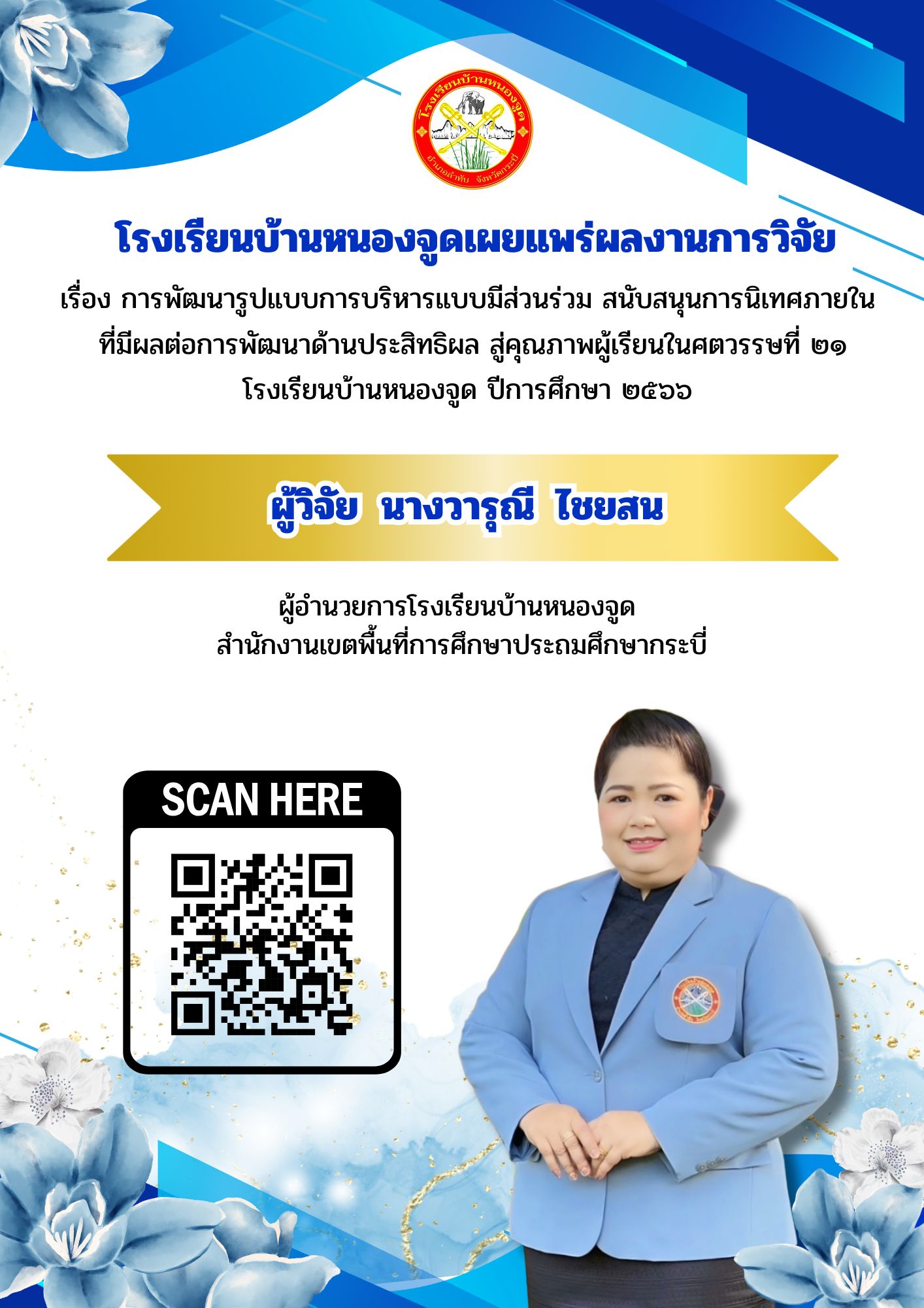 ชื่อผลงาน : การพัฒนารูปแบบการบริหารแบบมีส่วนร่วม สนับสนุนการนิเทศภายใน ที่มีผลต่อการพัฒนา ด้านประสิทธิผล สู่คุณภาพผู้เรียนในศตวรรษที่ 21 โรงเรียนบ้านหนองจูด ปีการศึกษา 2566